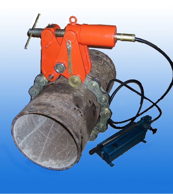 鏈條式液壓擠刀:系天津市自來水公司轉(zhuǎn)讓專利產(chǎn)品:專利號ZL90203081.7。以手動泵為動力,驅(qū)動液壓缸工作,再經(jīng)過拉緊鏈條刀,使刀輪均勻切入管壁,利用灰鑄鐵的切口效應(yīng),使管材斷開,操作簡便生產(chǎn)效率高。